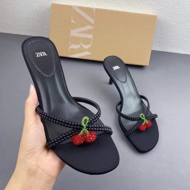Beaded Cherry Detail Black Heeled Sandals...