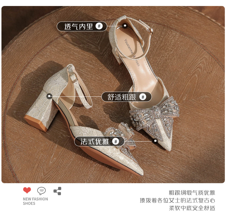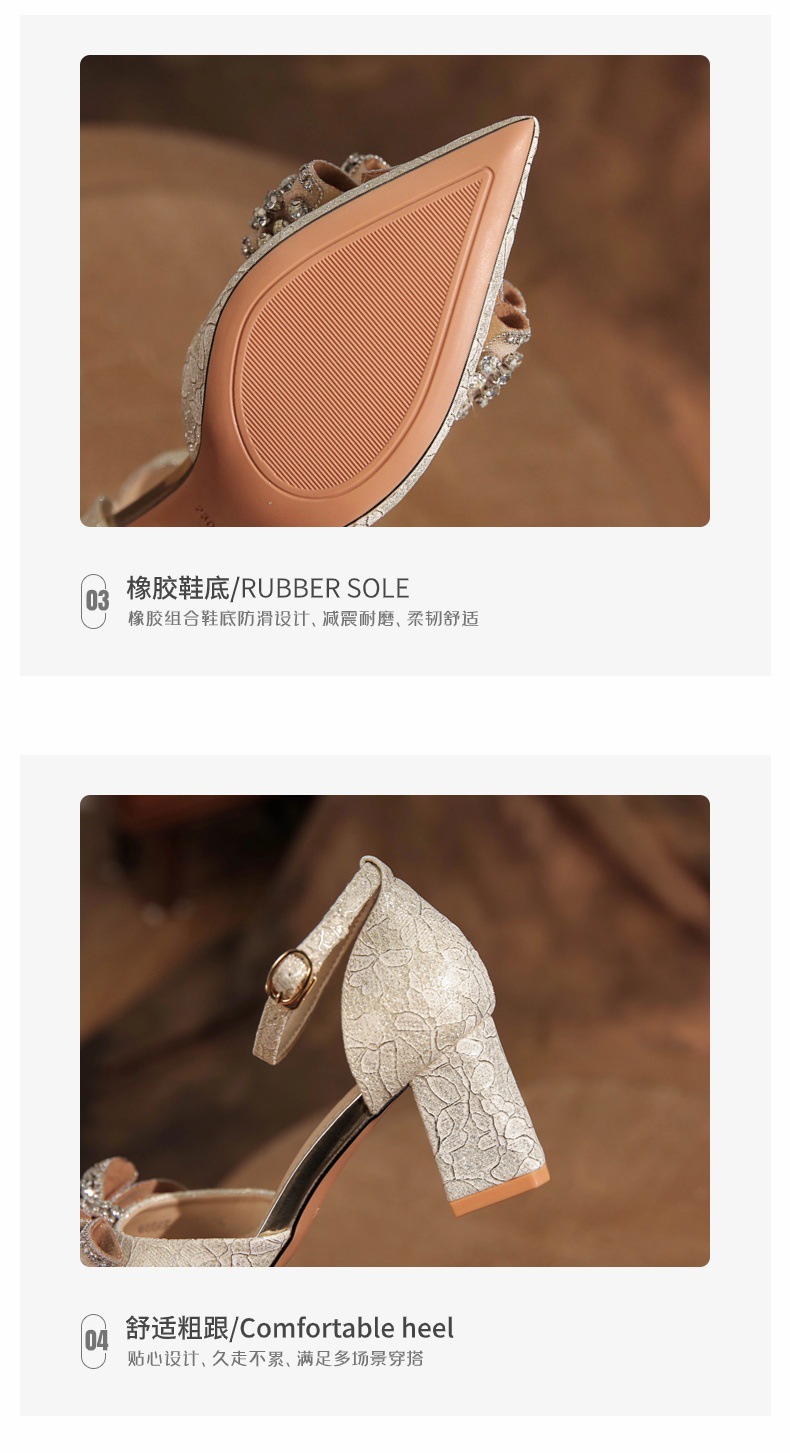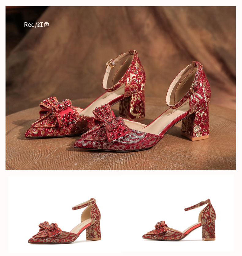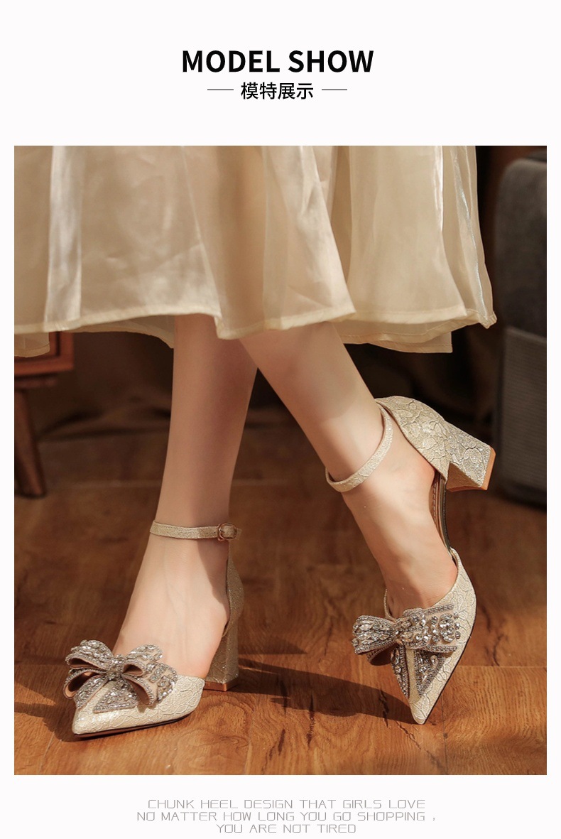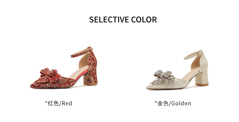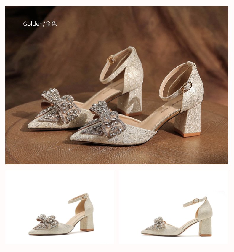 6666F-016 Bowknot thick heel hollow one-strap wedding shoes wedding banquet temperament elegant high heels dress