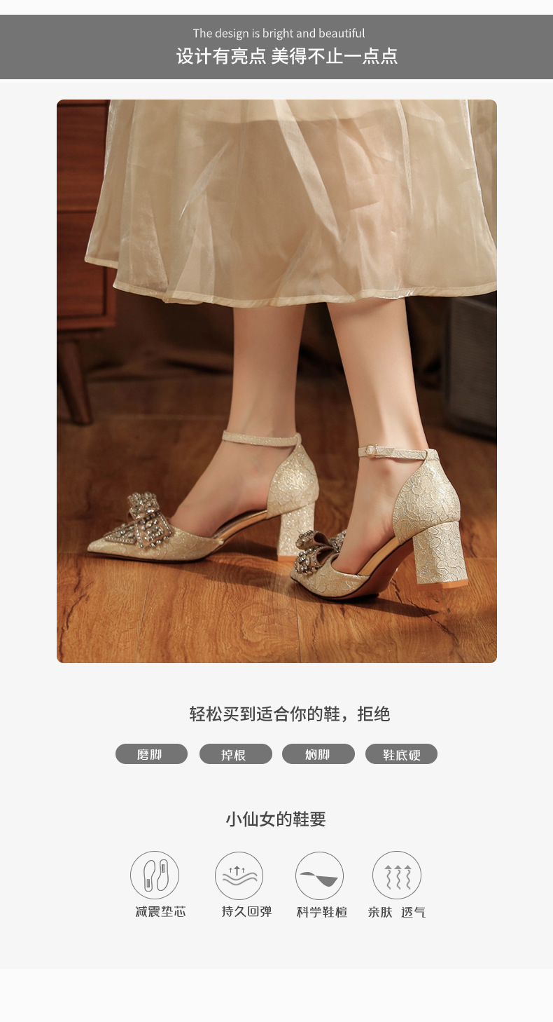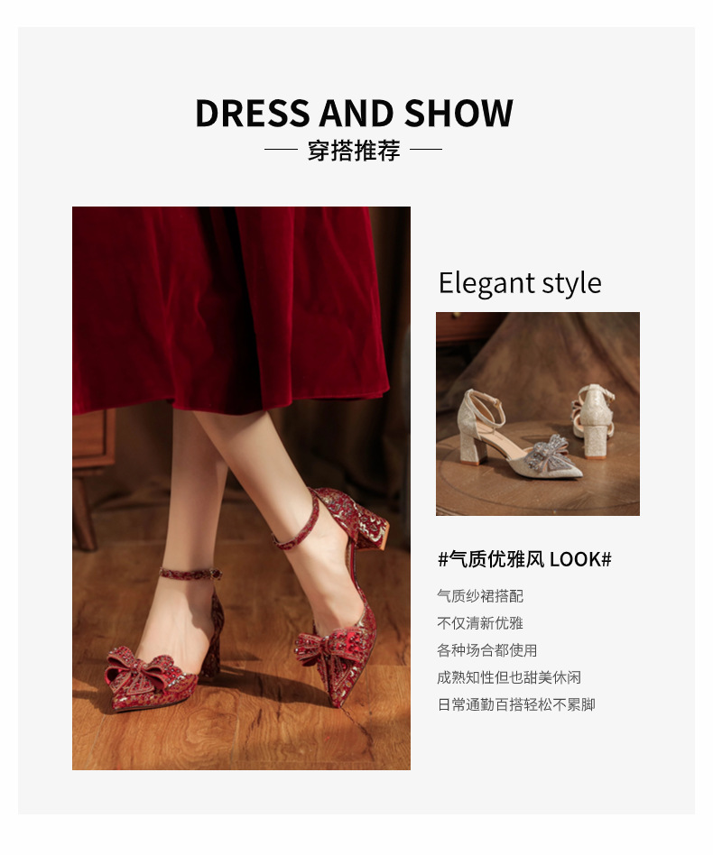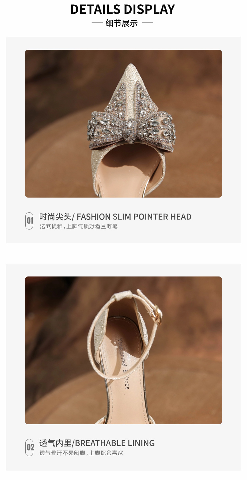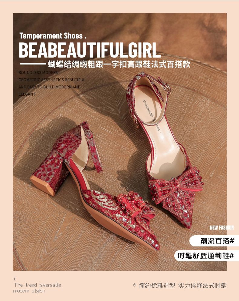 6666F-016 Bowknot thick heel hollow one-strap wedding shoes wedding banquet temperament elegant high heels dress