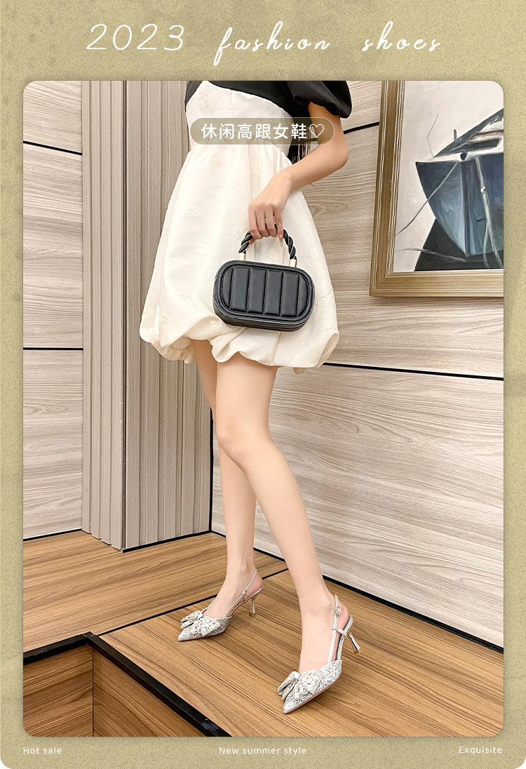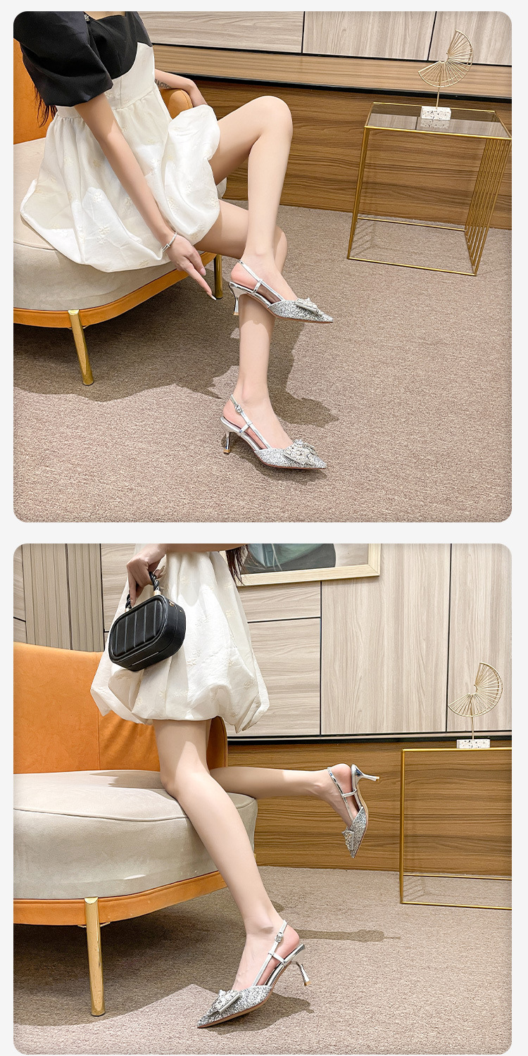 Black pointed high heels French banquet style bow two-way wear fashionable sexy all-match outdoor sandals for women