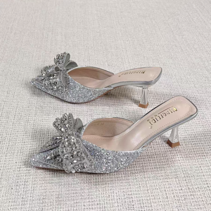 G-Sparkling Silver Crystal Bow Pointed Toe Mule Heels