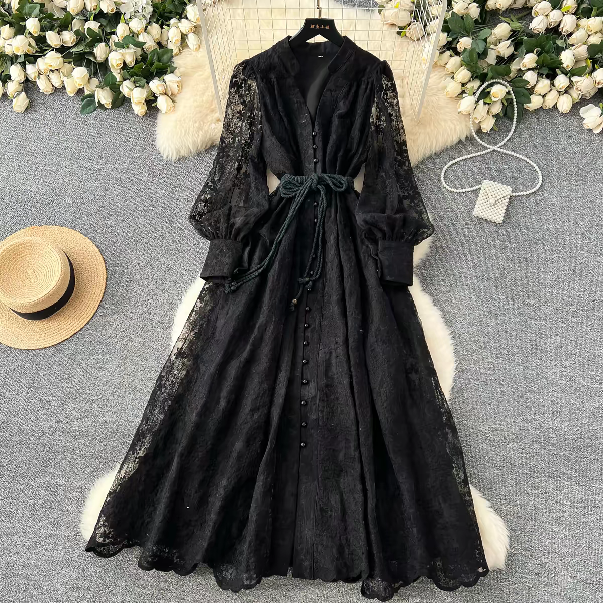 Make an elegant statement with our stunning Floral Lace Gown Dress. Perfectly blending vintage charm with modern style, this dress features intricate floral embroidery, a flattering V-neck, and romantic lantern sleeves. Complete with a waist tie to define your silhouette and a beautiful scalloped hem, it’s the ideal choice for weddings, parties, or any special occasion.