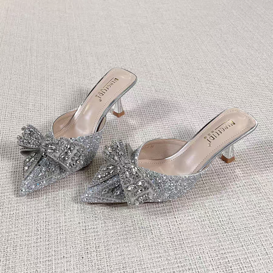 G-Sparkling Silver Crystal Bow Pointed Toe Mule Heels