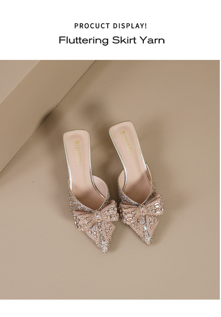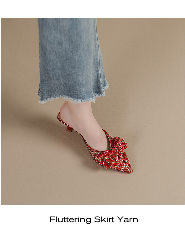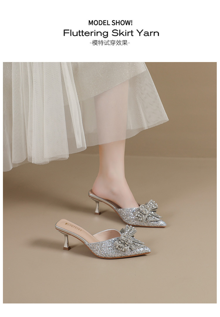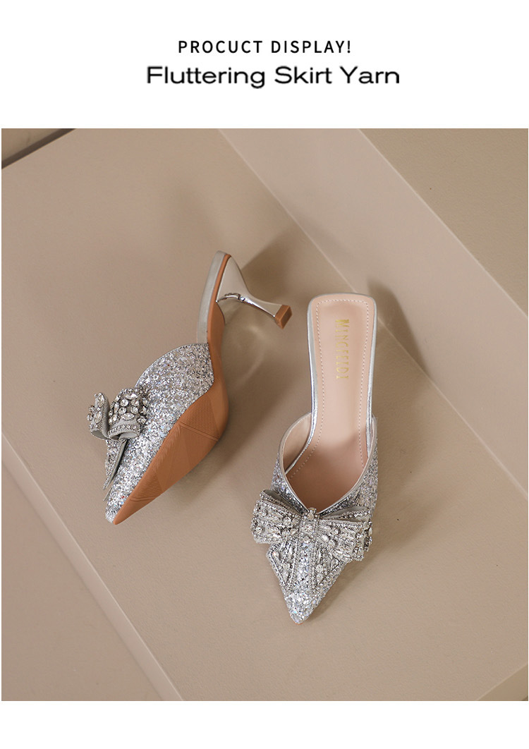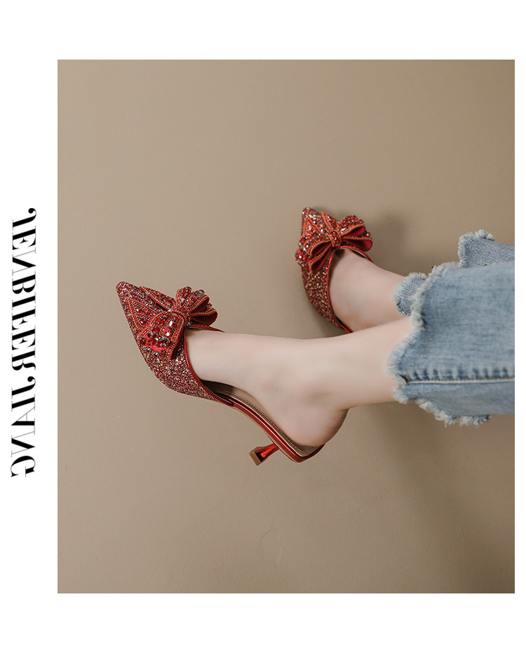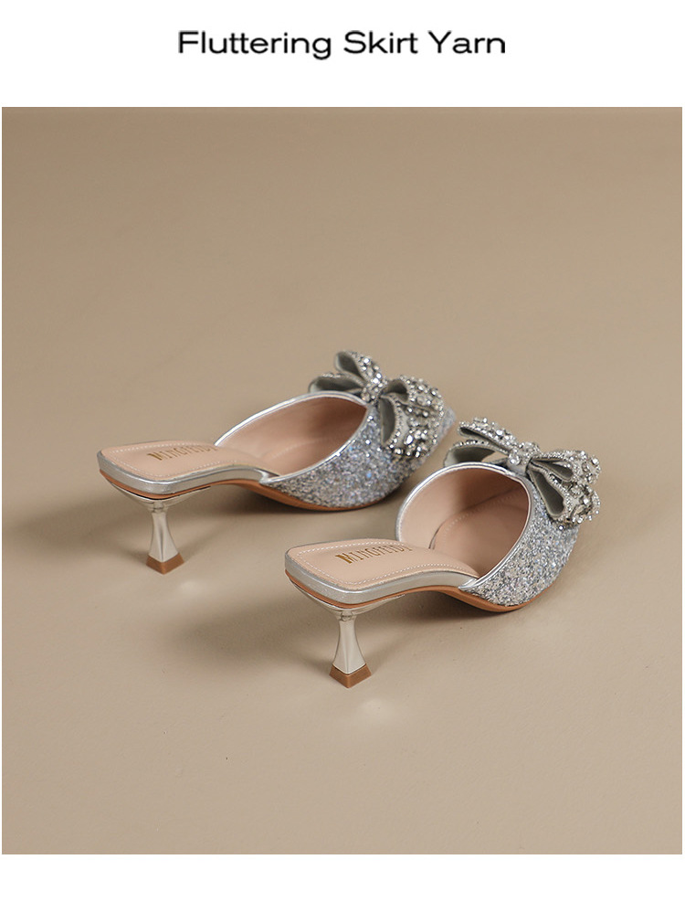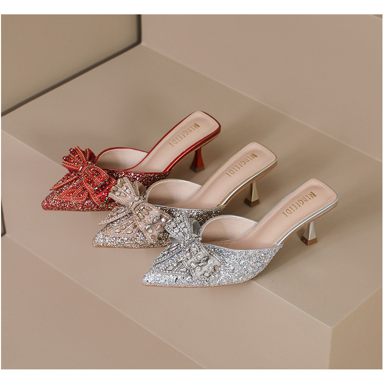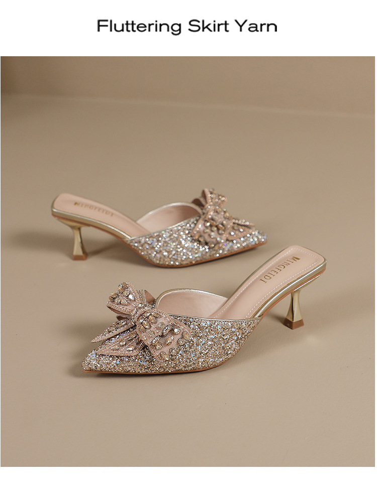 Rhinestone bowknot half slippers for women summer outdoor wear 2024 new pointed stiletto high heel temperament sandals