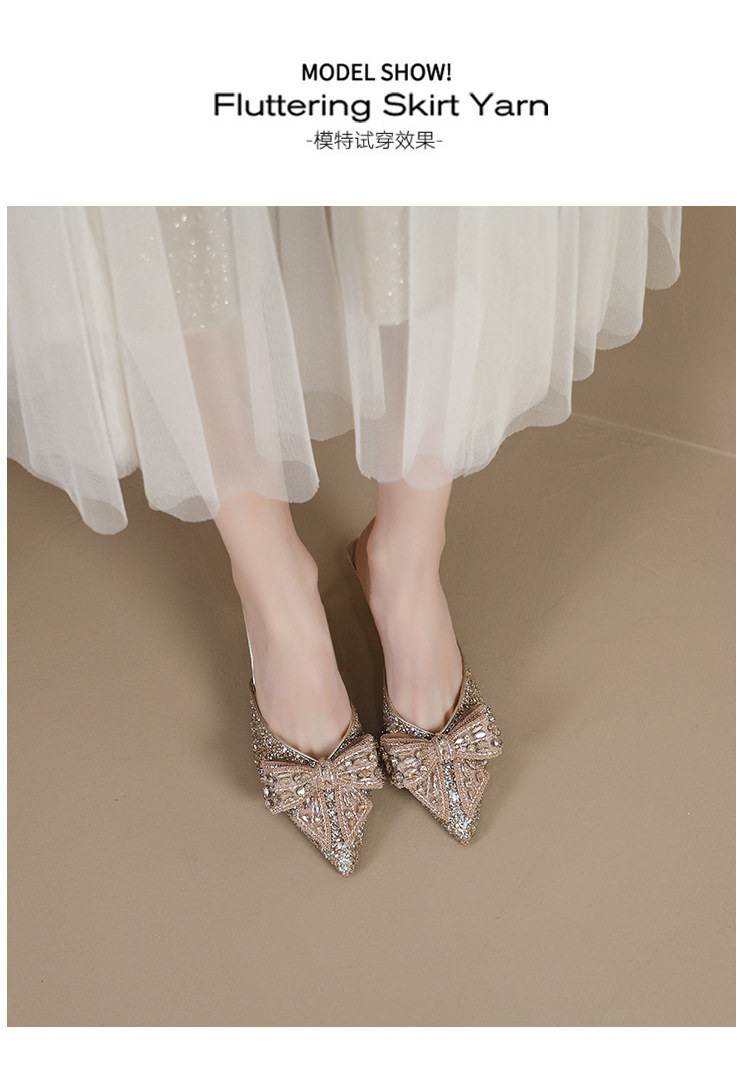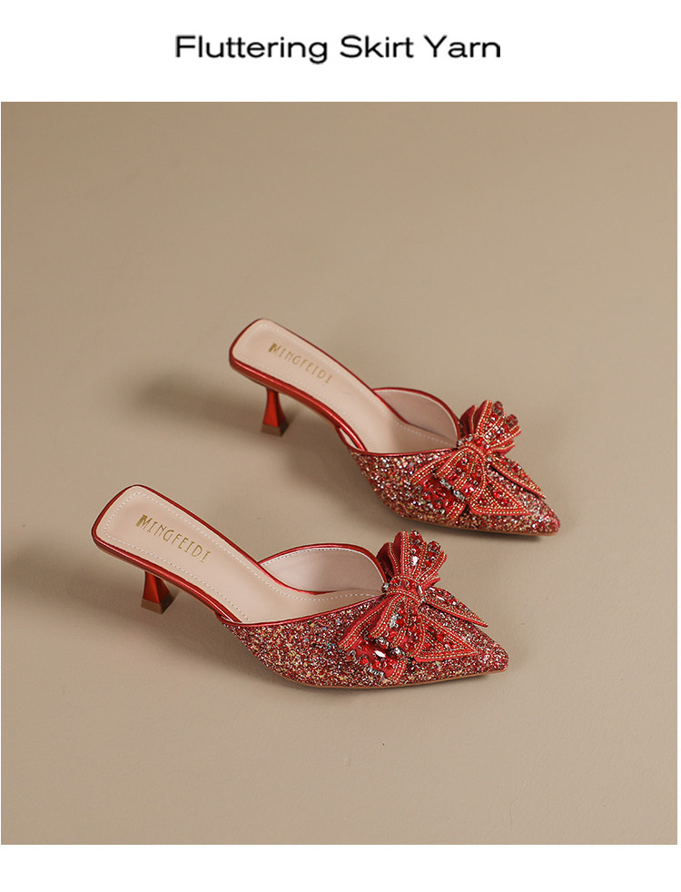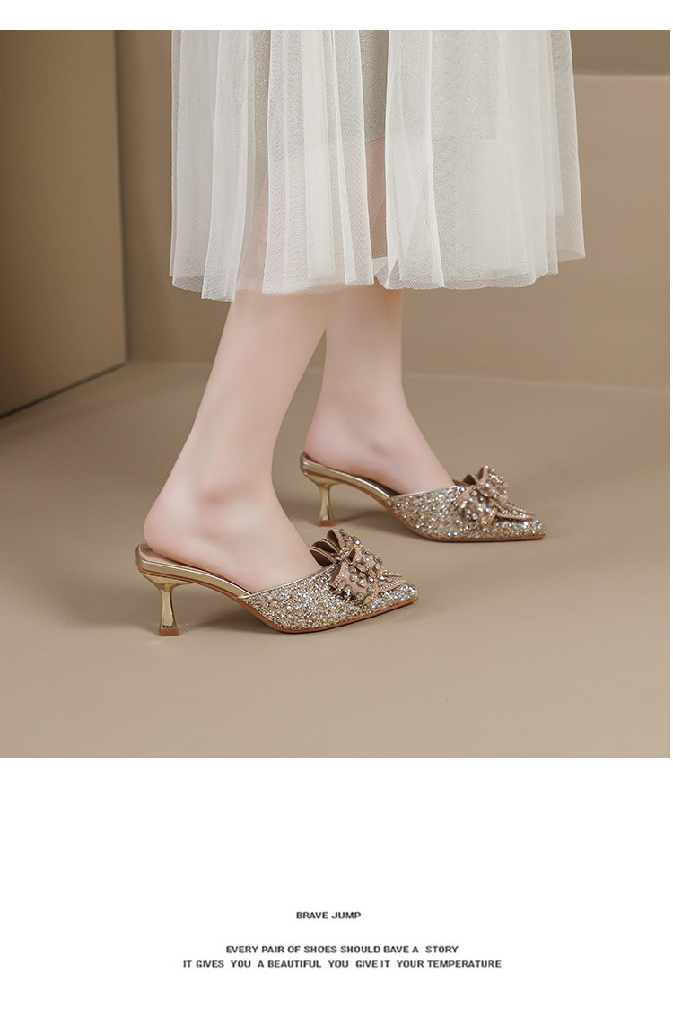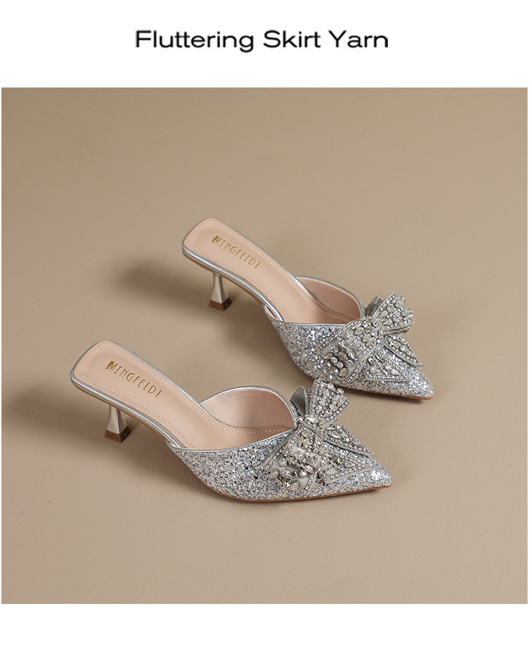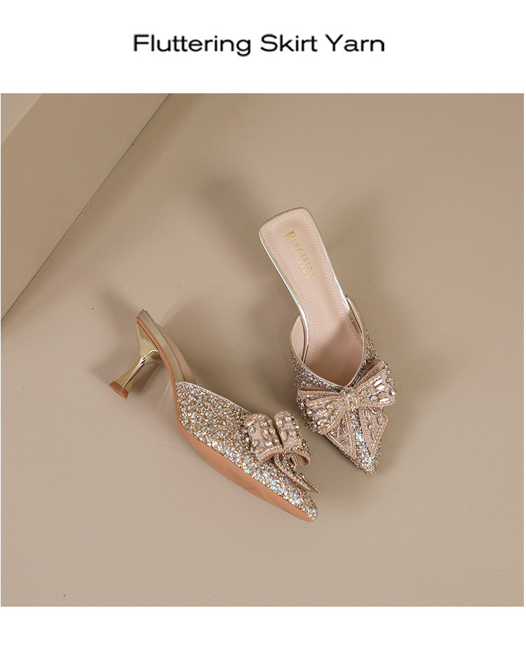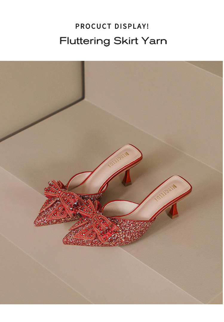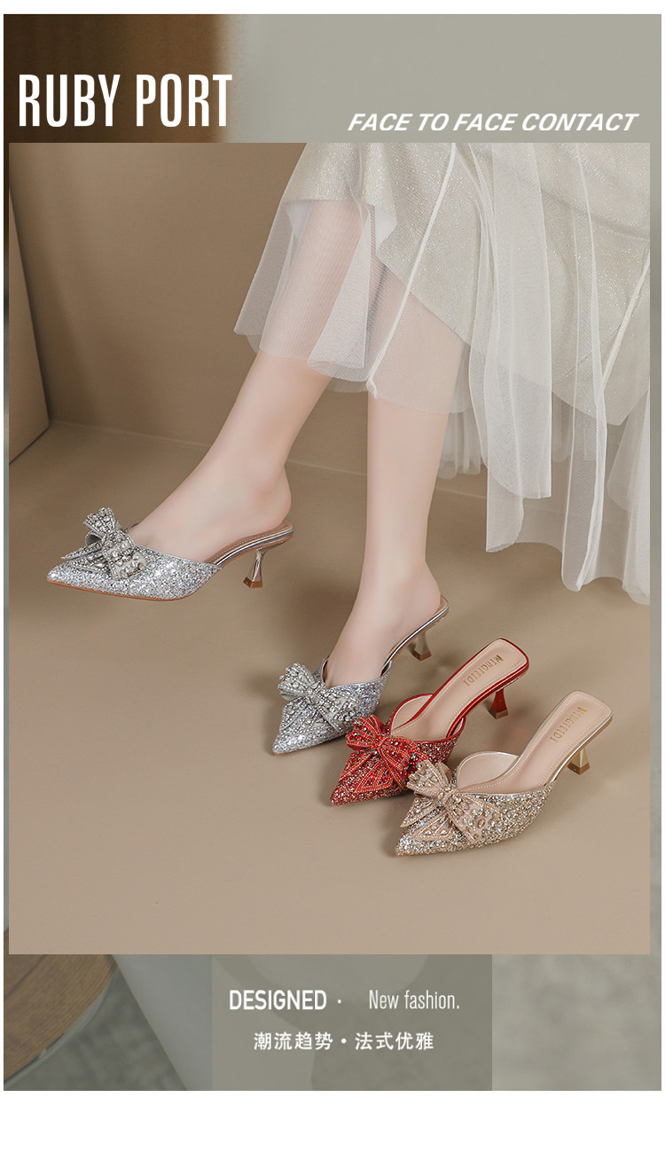 Rhinestone bowknot half slippers for women summer outdoor wear 2024 new pointed stiletto high heel temperament sandals