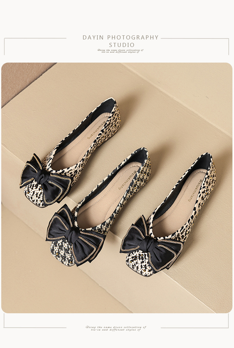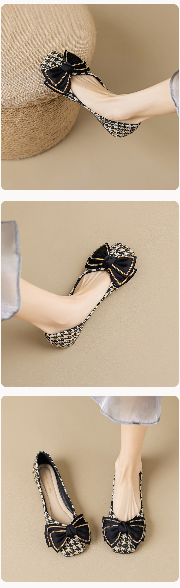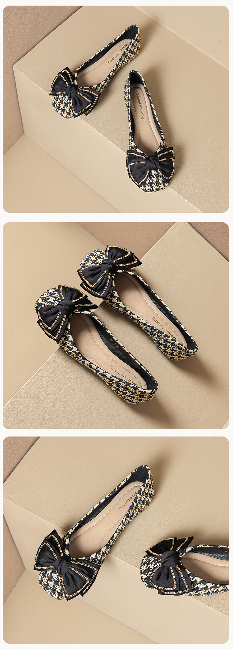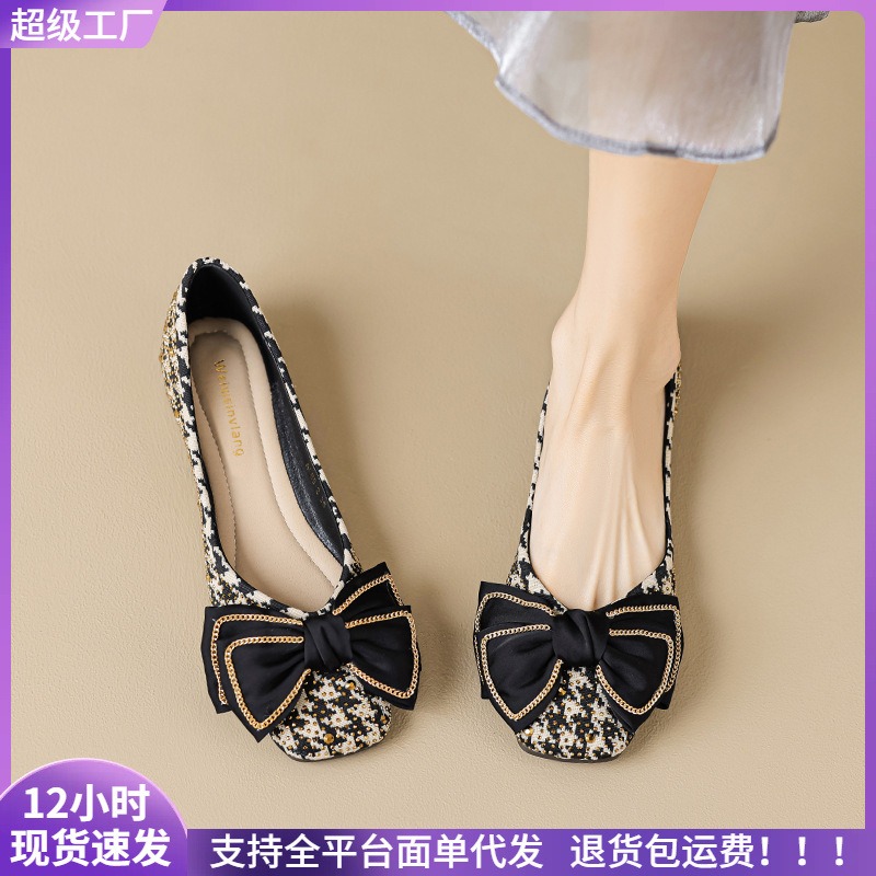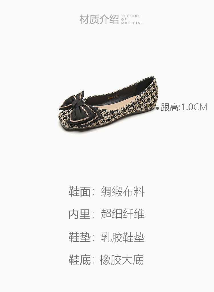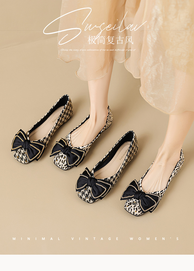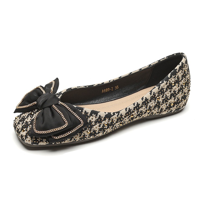 Weiwei Girl 689-2 Square Toe Single Shoes Women's Flat Butterfly Knot One-foot Houndstooth Soft Sole Shallow Mouth Toe Shoes