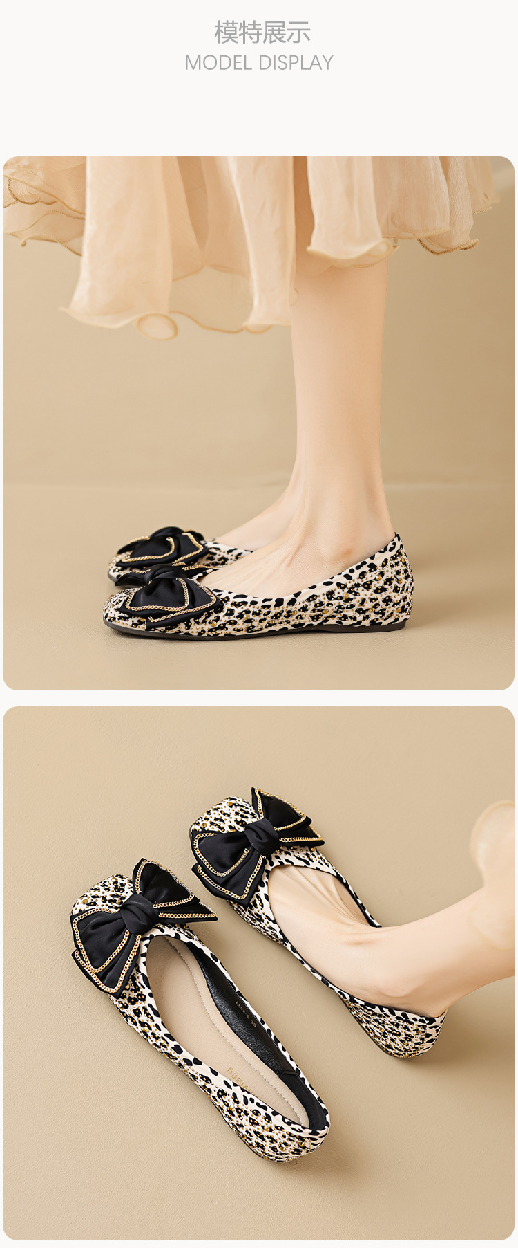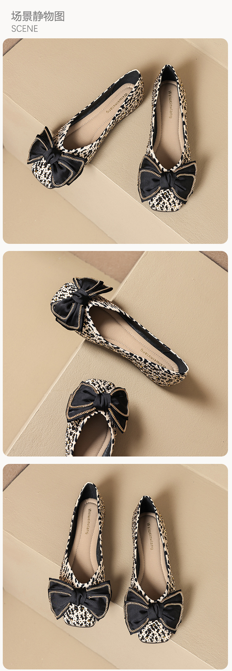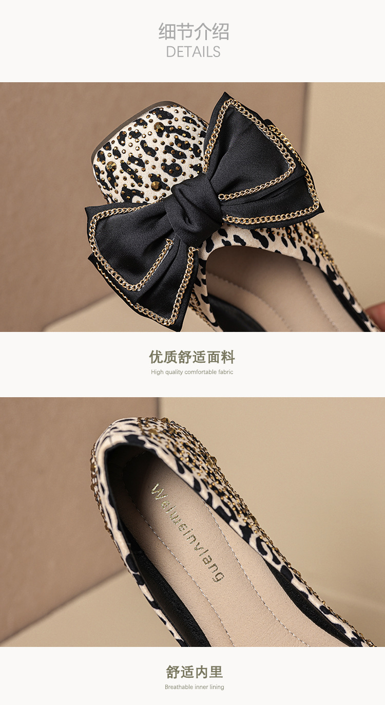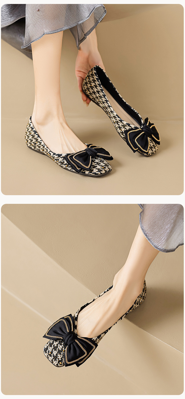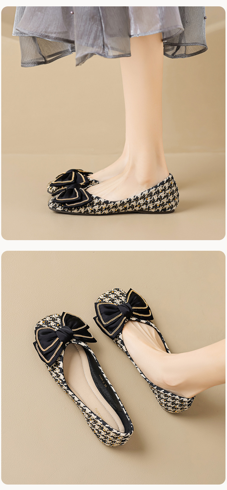 Weiwei Girl 689-2 Square Toe Single Shoes Women's Flat Butterfly Knot One-foot Houndstooth Soft Sole Shallow Mouth Toe Shoes